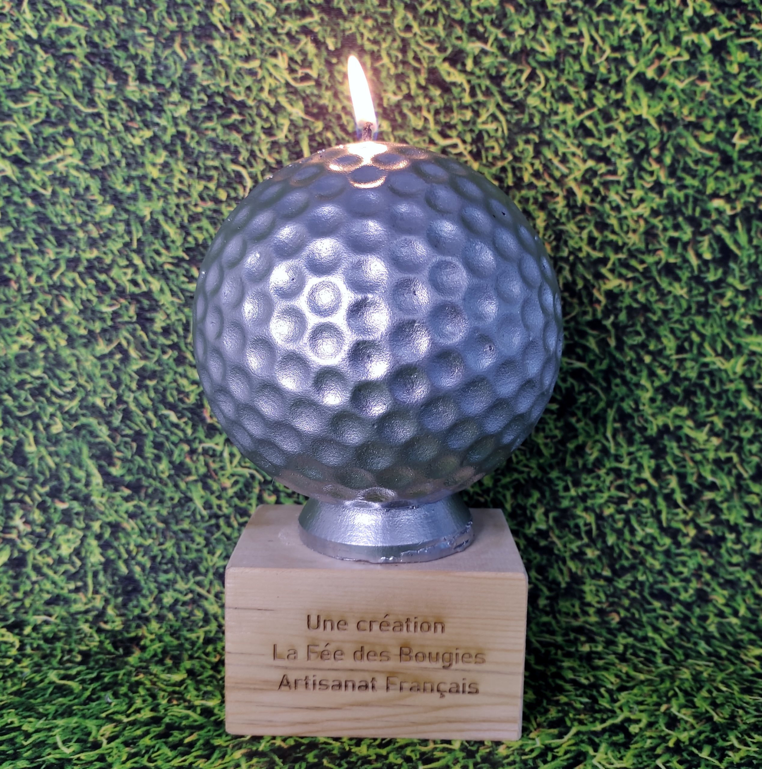 De 12 cm de diamètre, cette bougie inédite est fixée sur un socle en bois gravé puis verni. La balle, ici de couleur argentée, fait un joli contraste avec le socle qui se personnalise selon vos souhaits. Un logo, un nom, une date, un événement…, tout est possible!