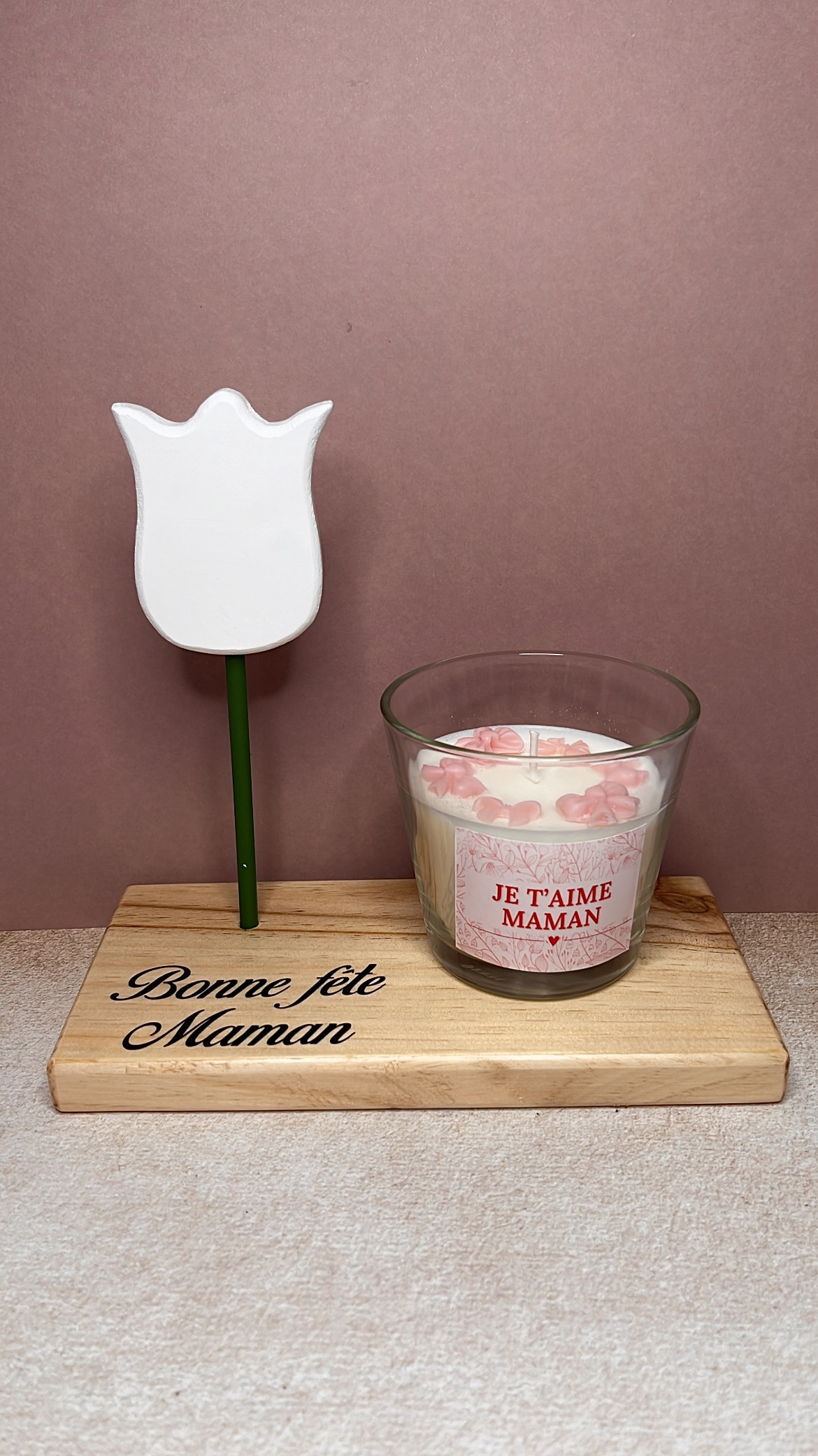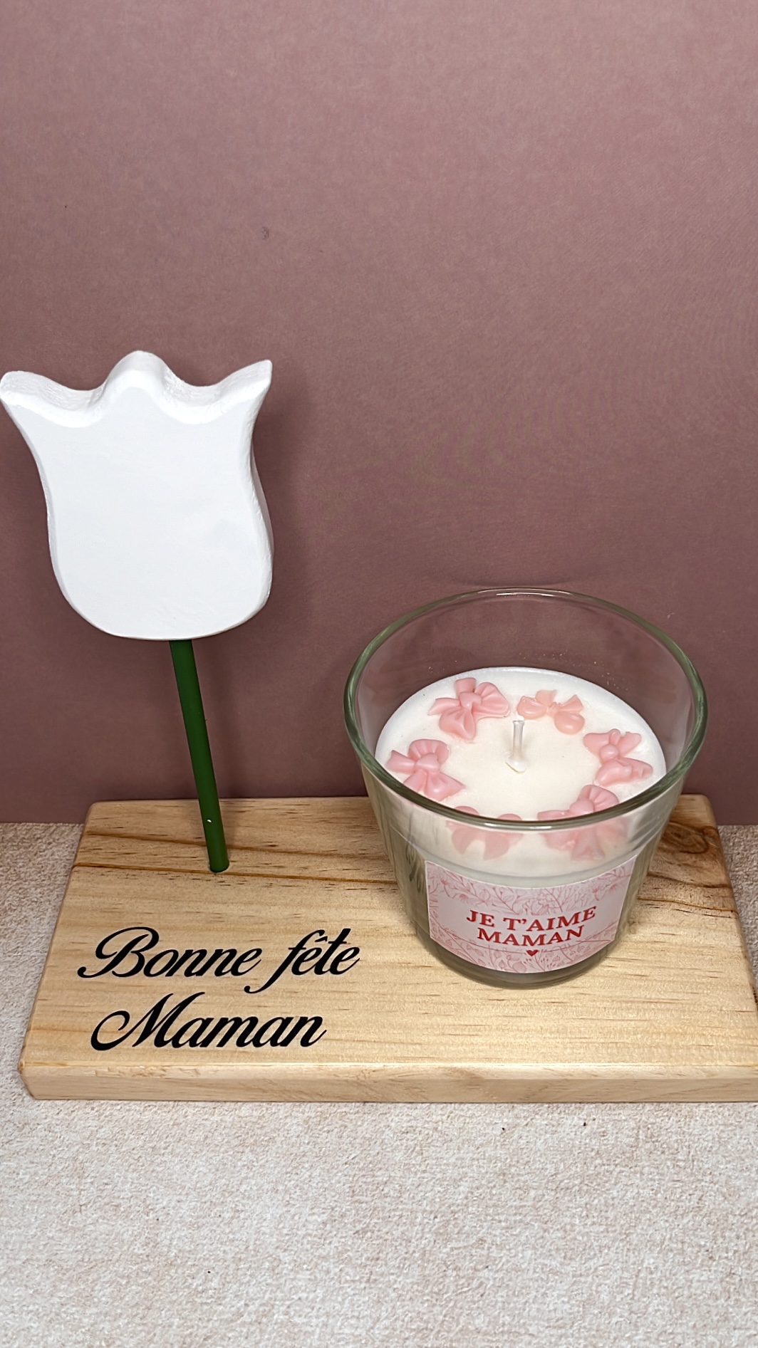 Célebrez la Fête de votre Maman avec notre bougie ornée de ces petits noeuds rose pâle, parfumée à la rose ancienne et délicatement posée sur son socle en bois personnalisé.