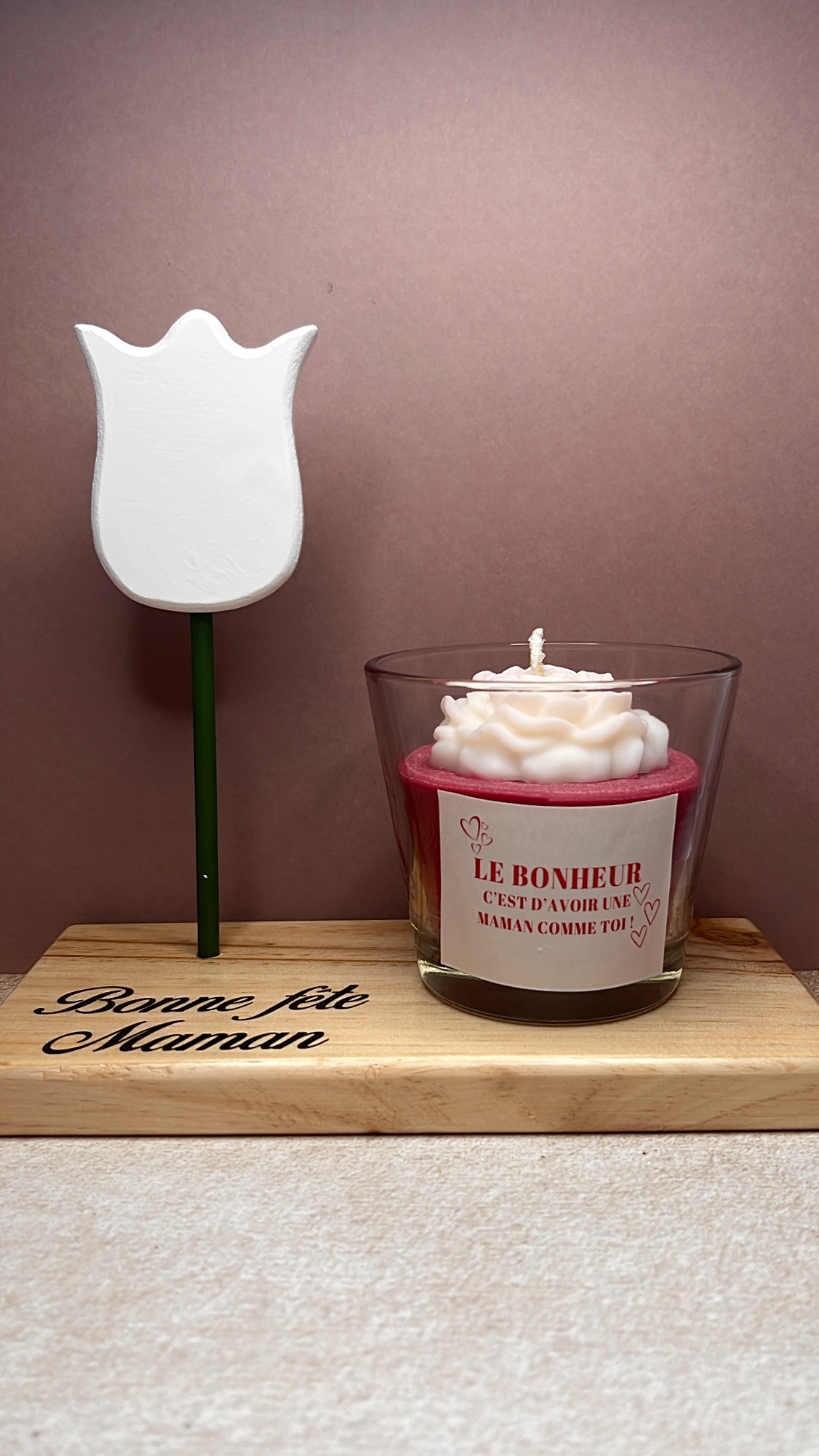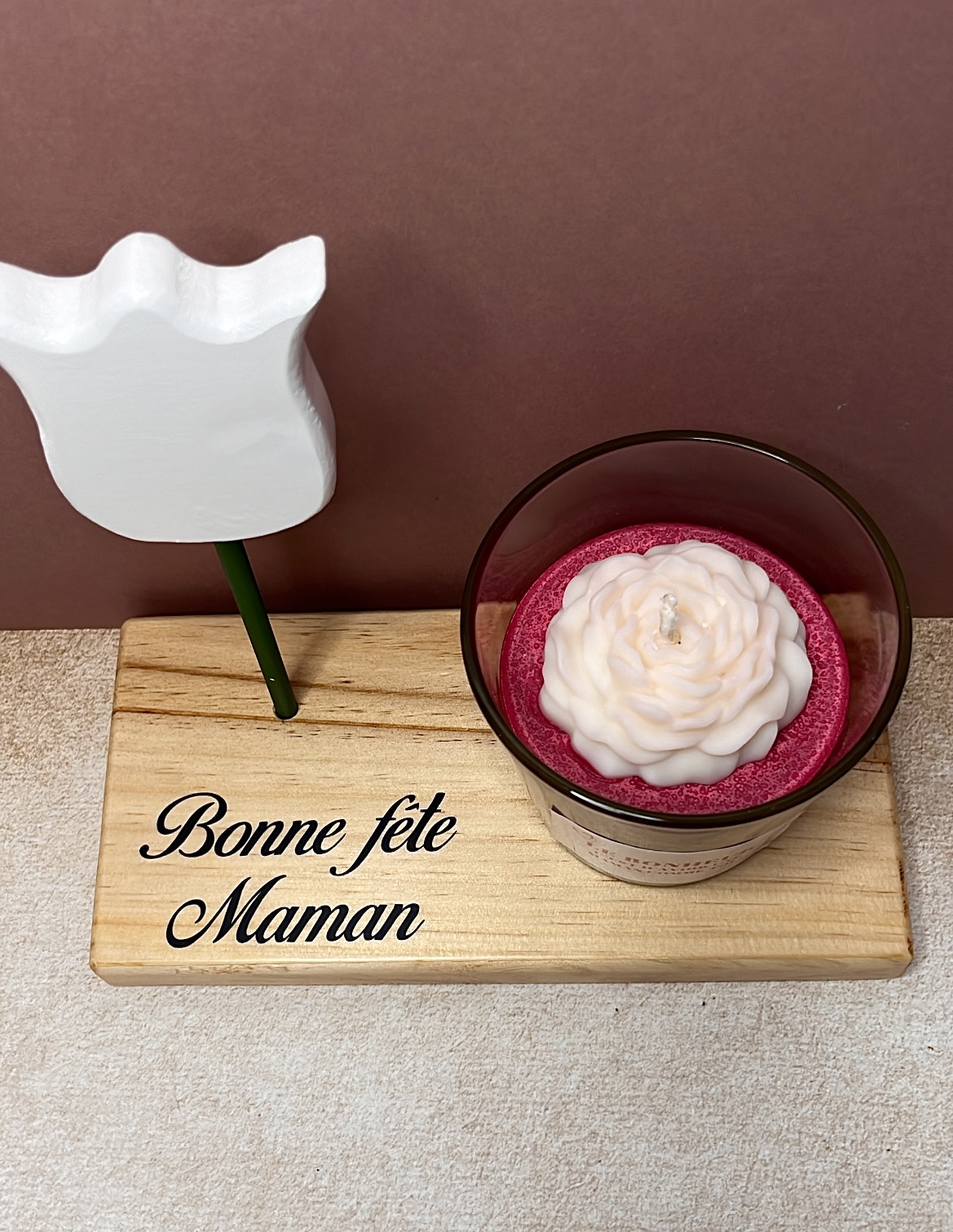 Célebrez la Fête de votre Maman avec notre bougie rose blanche, parfumée à la rose ancienne et délicatement posée sur son socle en bois personnalisé.