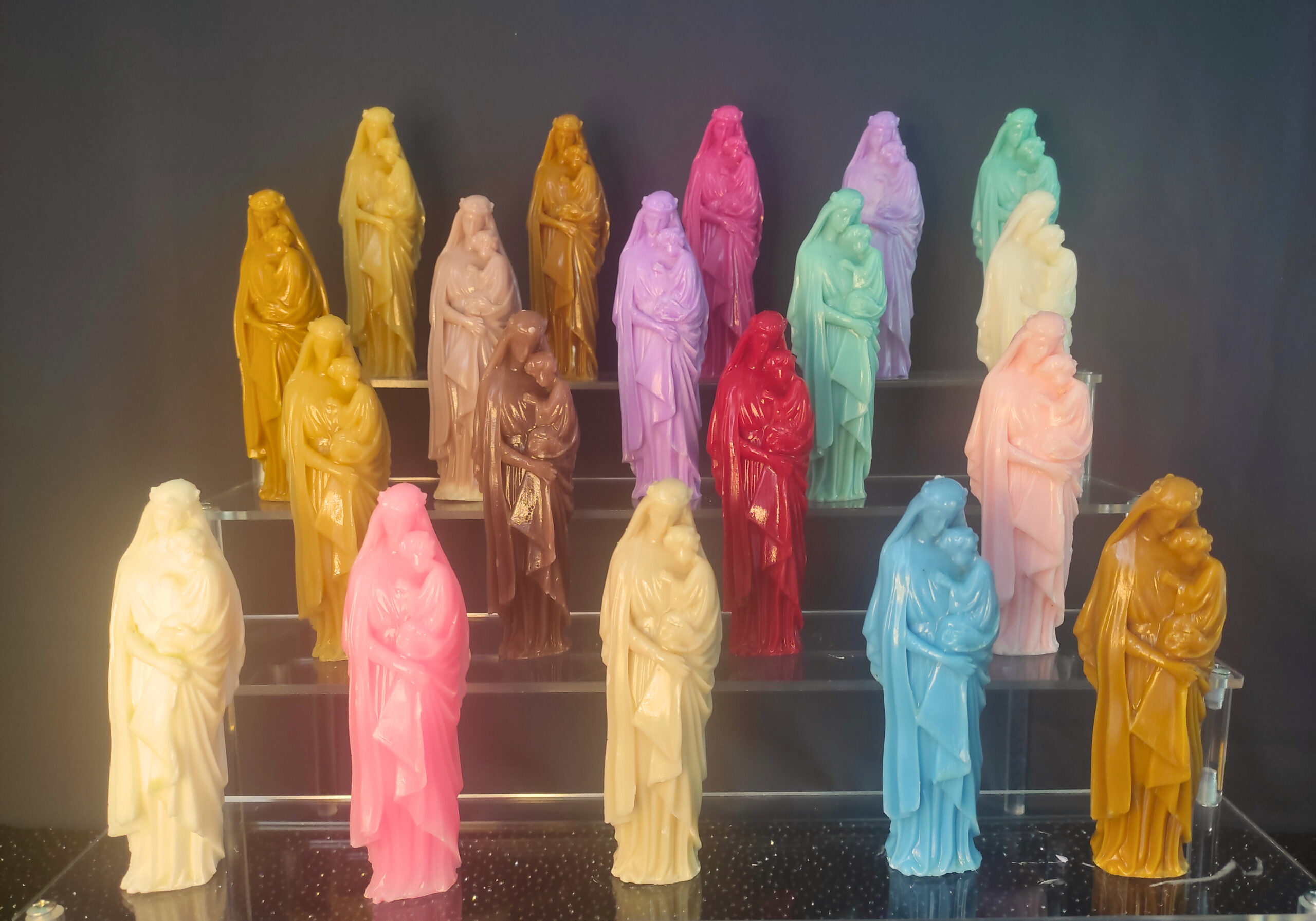 Cette reproduction miniature n’est pas une bougie traditionnelle. Une statuette de la Vierge ne pouvant pas être consumée par respect pour la figure religieuse qu’elle représente, elle a été confectionnée sans mèche.